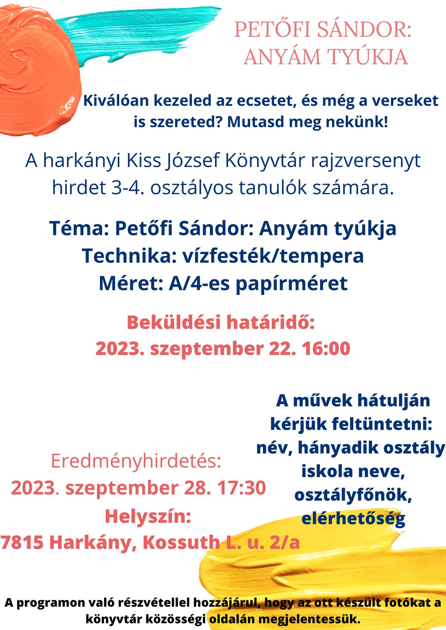 A harkányi Kiss József Könyvtár ugyanis rajzversenyt hirdet, aminek témája Petőfi Sándor verse. Engedd el a fantáziád és legyen tiéd a legszebb művészi alkotás! A/4-es méretben 2023.09.22. 16:00-ig adhatod le remekművedet, melynek hátuljára ne felejtsd el feltüntetni a nevedet, címedet, iskolád és osztályfőnököd nevét és elérhetőségi adataidat.