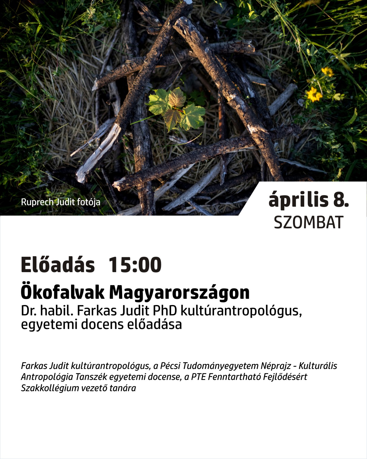 Dr. Farkas Judit kultúrantropológus, egyetemi docens előadásában 15:00 kezdettel és „Ökofalvak Magyarországon” címmel előadás veszi kezdetét, melynek a fenntartható fejlődés lesz a fő témája. Az előadást követően a helyi szervezők, gazdák, előadók és kiállítók közös beszélgetésre vagy együtt gondolkozásra invitálnak mindenkit a vidékre költözésről és maradásról, vidéki életmódról, ökoközösségekől.