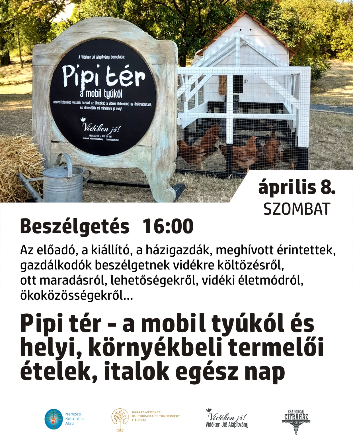Minden bizonnyal érdekesség lesz a „Pipi tér” – a mobil tyúkól – is, a helyszínen helyi termelői ételek és italok, gasztronómiai fogások és jó hangulat vár Mindenkit!
