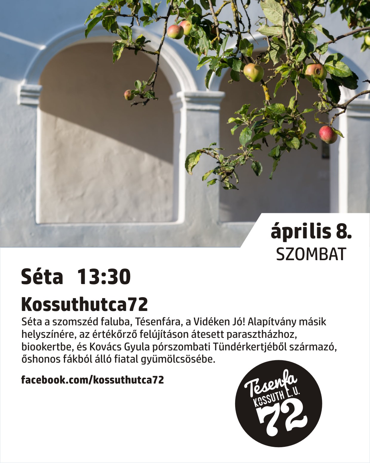 A kiállításon 13 órás kezdettel Rupreth Judit 2022-ben Hemző Károly díjat nyert fotóriportjából tekinthetnek meg válogatott képeket az érdeklődők. Ezt követően 13:30 perckor a szomszédos Tésenfa településére egy rövid sétára invitálja Önöket a Cifraház, célállomás a Vidéken Jó Alapítvány másik helyszíne, a Kossuth u. 72. szám alatt értékőrző felújításon átesett parasztház és biokert. A helyszínen Kovács Gyula őshonos fákból álló gyümölcsöse is megtekinthető lesz.