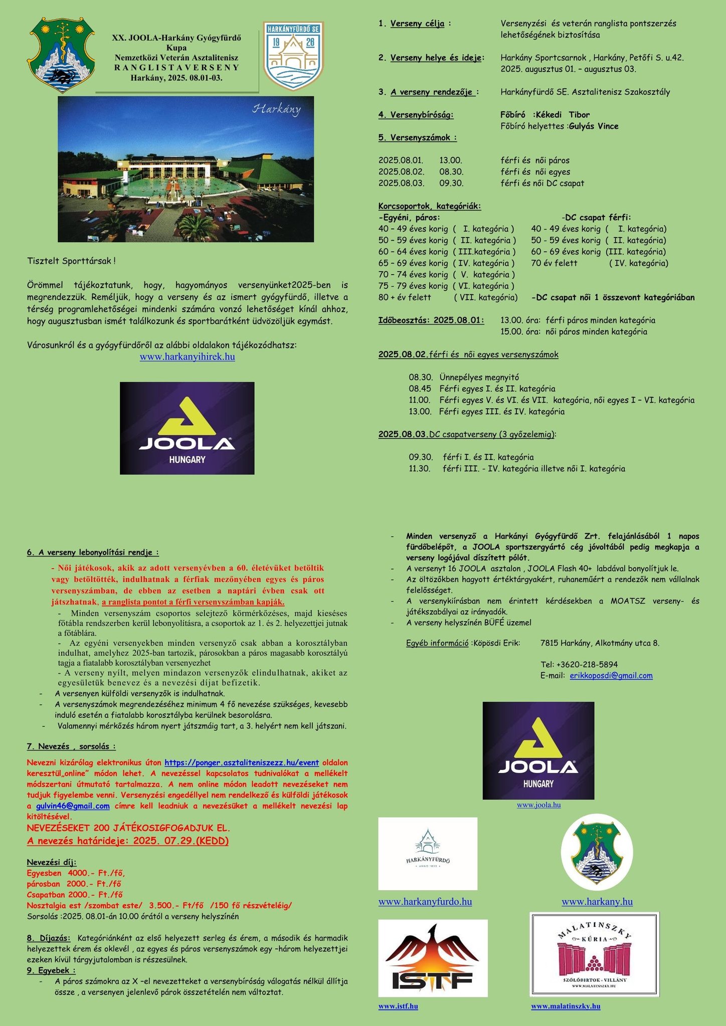 Harkány Városi Sportcsarnok Petőfi Sándor u. 42., Harkány, Baranya, MagyarországHarkány Gyógyfürdő Kupa és veterán asztalitenisz verseny 2025.08.01-03. között: ez a XX. JOOLA - Harkány Gyógyfürdő Kupa - 3 versenyszám, 3 korcsoport, 3 nap!