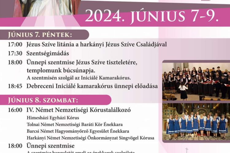 Jézus Szíve Búcsú Harkányban 2024.06.07. – 2024.06.09. között, koncertekkel, kórus fellépésekkel, német nemzetiségi kórusokkal a Jézus Szíve templomban.