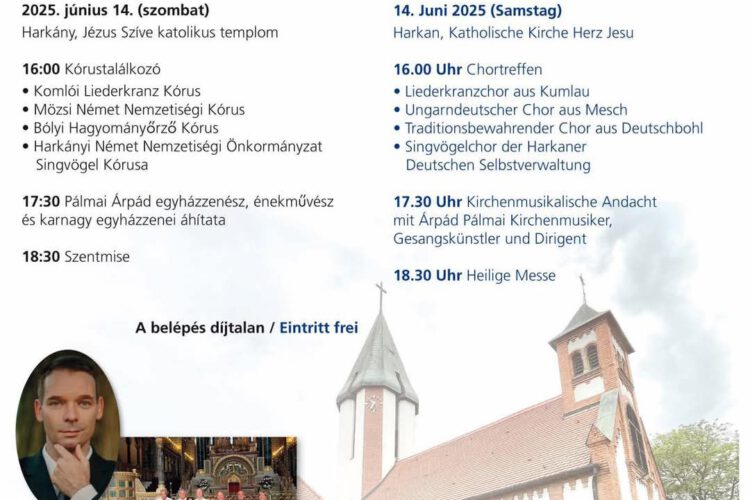 Német Nemzetiségi Kórustalálkozó Harkányban 2025.06.14-én a Jézus Szíve Plébánián 16 órától négy kórus fellépésével, szentmise 18.30-tól.