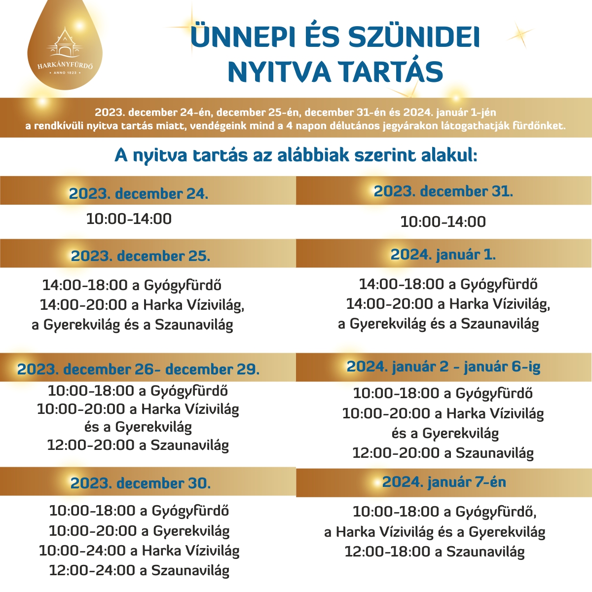 2023. december 24., december 25., december 31. és 2024. január 1.: rendkívüli nyitvatartás, a vendégek mind a 4 napon délutános jegyárakon látogathatják a fürdőt.